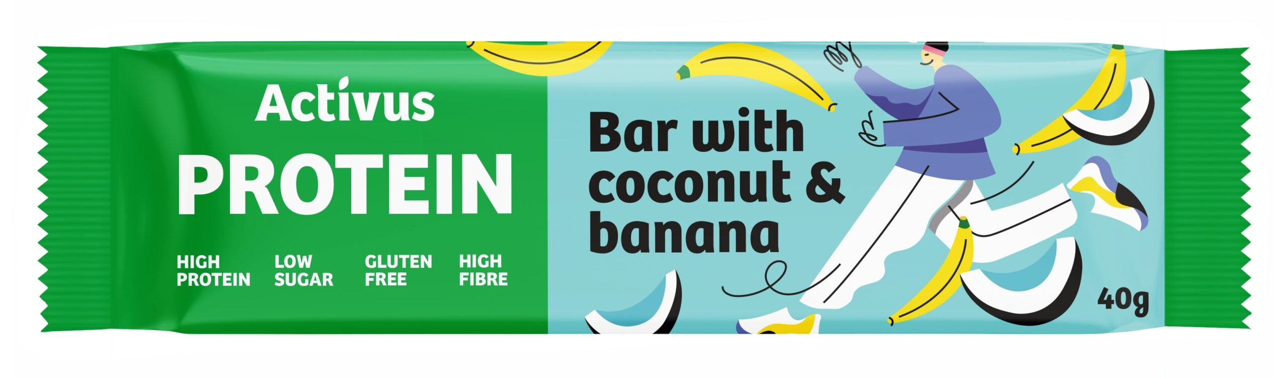 ACTIVUS Proteīna batoniņš ar kokosriekstu un banānu garšu ir optimāla izvēle tiem, kas vēlas papildināt savu uzturu ar kvalitatīviem proteīniem.